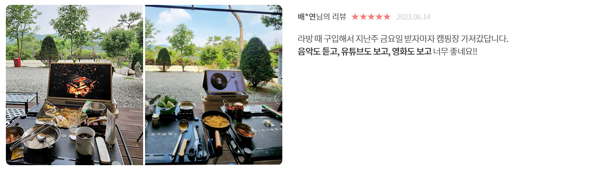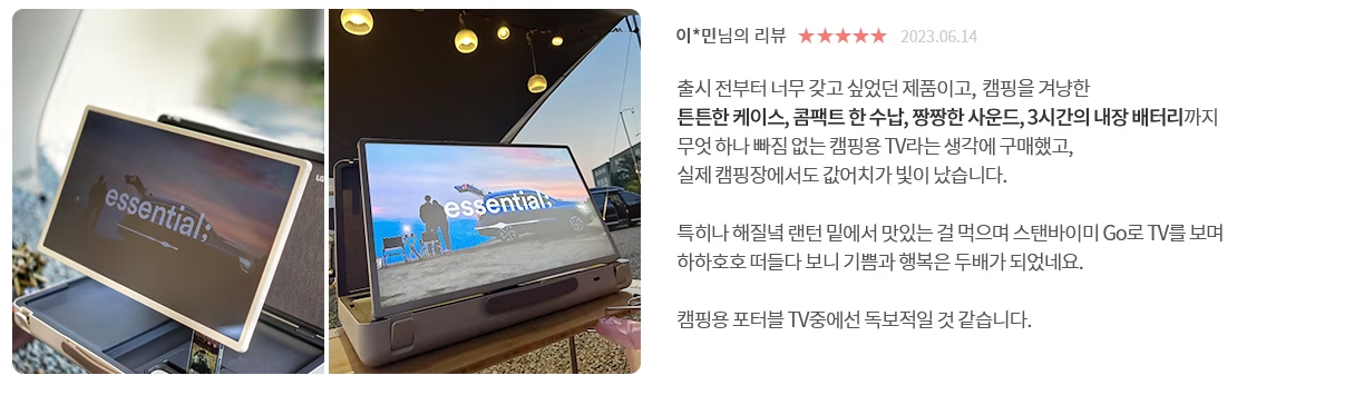 역시 상세한 가전제품 리뷰는 테크몽 님이 짱이네요. 축구 게임과 노래방 사용에 대한 반응도 저 정도인데, 아시안게임 축구 결승 금메달을 캠핑에서 같이 응원했으니 어땠겠습니까? 진짜.. 캠핑 좋아하시는 분들 스텐바이미 고는 무조건 사셔요.. 이건 진짜 사셔야해요. 너무 너무 캠핑이 달라집니다!