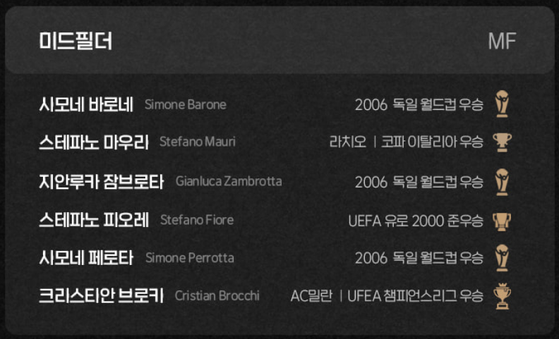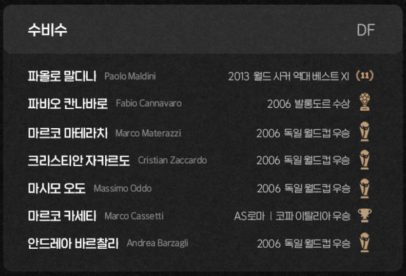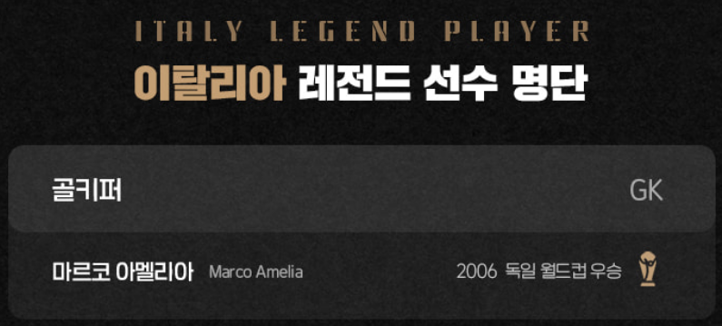 이탈리아의 레전드 명단을 보면 확실히 수비수 라인이 진짜 레전드입니다. 말디니부터, 칸나바로, 마테라치, 자카르도 센터백과 좌우 윙백 진짜 거를 곳이 없을 정도로 카테라치오(빗장수비) 그 시절의 이탈리아 수비를 다시 볼 수 있으면 정말 좋을 것 같고, 지금은 피파 같은 게임에서 젊은 친구들은 그들의 이름을 알고 있을텐데 진짜 이들은 어마어마한 수비수들이었습니다. 그리고 미드필더 라인은 잠브로타나 페로타 빼고는 조금 아쉽긴 한데 이건 제가 개인적으로 피를로와 가투소를 너무 사랑하기 때문에 그럴 수도 있구요. 키퍼는 부폰일 줄 알았는데 아멜리아네요. 부폰 형은 너무 선수시절 관절 많이 갈아먹었나 봐요..