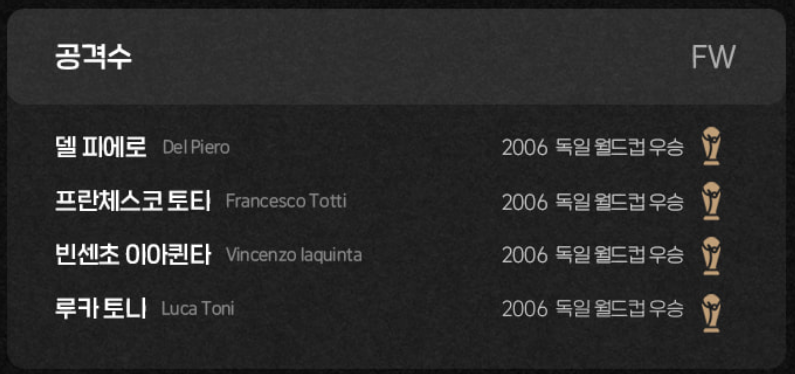 공격수는 인자기 형이 골대 앞에서 죽치고 있다가 골 넣는 거랑 패널티 킥 실축하는 로베르토 바조가 없는 것 빼고는 아쉬울 게 없는 라인업이네요. 특히 델 피에로와 토티는 진짜 살아있는 레전드인데, MLB에서 초청해서 KBO랑 붙인다는 월드투어 무산 된 것과는 정말 비교되는 레전드 명단이긴 합니다.