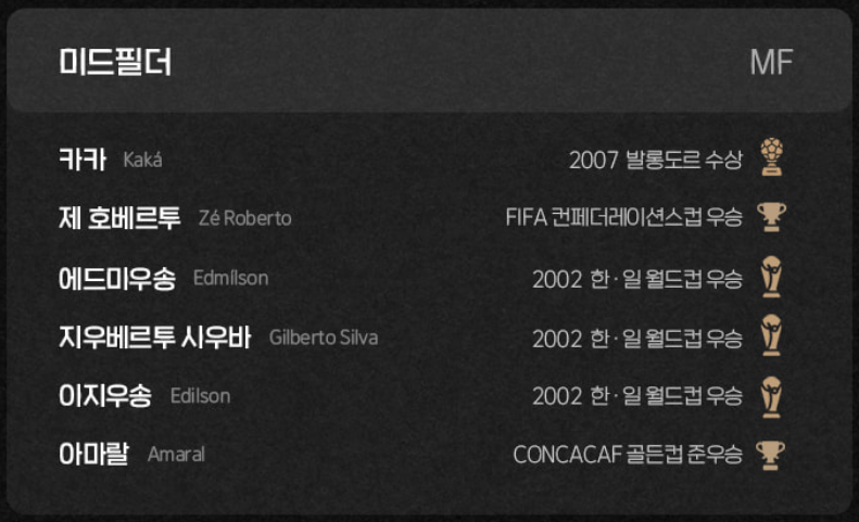 그리고 미드필더에서는 역시 카카가 가장 눈에 띕니다. 이탈리아에는 발롱도르가 수비수 최초 발롱도르 칸나바로 밖에 안 보이지만, 브라질 레전드는 발롱도르 투성입니다. 그 중에서도 진짜 짧은 전성기를 보냈지만, 그 전성기의 기량이 진짜 눈부셨던 카카가 한국에서 못다한 그 한을 풀어주었으면 좋겠습니다. 제 호베르투, 에드미우송, 지우베르투 시우바.. 아 한국식 발음 이거 쫌 불편하긴 한데, 이들도 다 진짜 레전드네요.